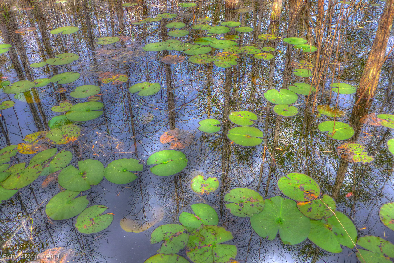 Yellow Flowers are Carnivarous Bladderwort Plants (Utricularia), White Flowers are Fragrant Water Lily (Nymphaea odorata), Water Moccasin, Alligator Gar, Lumix TS4 Camera, Panoramas, HDR Experiments in the Vein of Monet and M.C. Escher