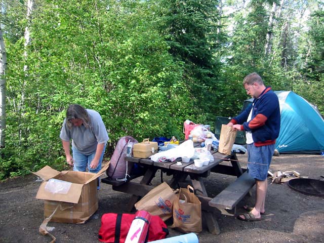 BWCA Canoe Trip Two Harbors, Brimson & Grand Marais Our trip began at the Minneapolis airport. Diana, Theron and Richard headed north in a rented car. The first stop was Two Harbors to take in some music at the annual folk festival. The city park is right down by the water with a great view of the lighthouse and ore docks. We met up with Peter and Karen Berger, relaxed on the lawn and listened to music. Just before dusk an ore boat came in. We got to watch the entire loading process as dozens of rail cars dumped their contents down a series of slides into the boat's hold. After dark we headed up Highway 2. Peter and Karen live at the end of a dead end road surrounded by national forest near the town of Brimson. Their property was all part of a Finnish homestead from the 1920s. In the morning we loaded up the canoe and made our way to Grand Marais. Remarkably, we arrived at the ranger station within minutes of Bruce, Mark and Austin. After doing a bit of last minute shopping we drove up the Gunflint Trail and camped in a USFS campground. The rest of the evening was spent packing and repacking. We had a nice meal of brats and hot dogs cooked over a campfire. The route we planned to take had several long portages. As it turned out we opted to retrace our steps and camp twice on Horseshoe Lake. The numbered green triangles indicate our actual campsites. The lighter gray line and starred triangle indicate the part we skipped. The orange circles indicate portages. In the end we paddled approximately 20 miles and carried our gear over 12 portages. Copyright 2002 by Richard Rathe & Family |