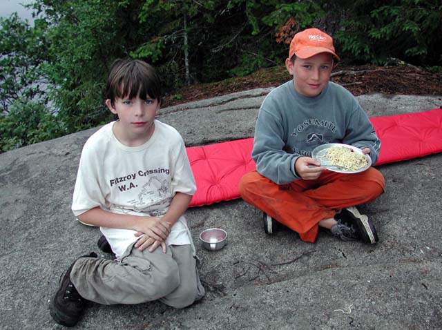 This time there was another party across the lake from us, but we could barely tell they were there. We cooked our last meal of pasta with sun-dried tomatoes, basil and pine nuts. The now familiar rock served as our dining room. We hit the tents early for a well deserved rest. Copyright 2002 by Richard Rathe & Family |